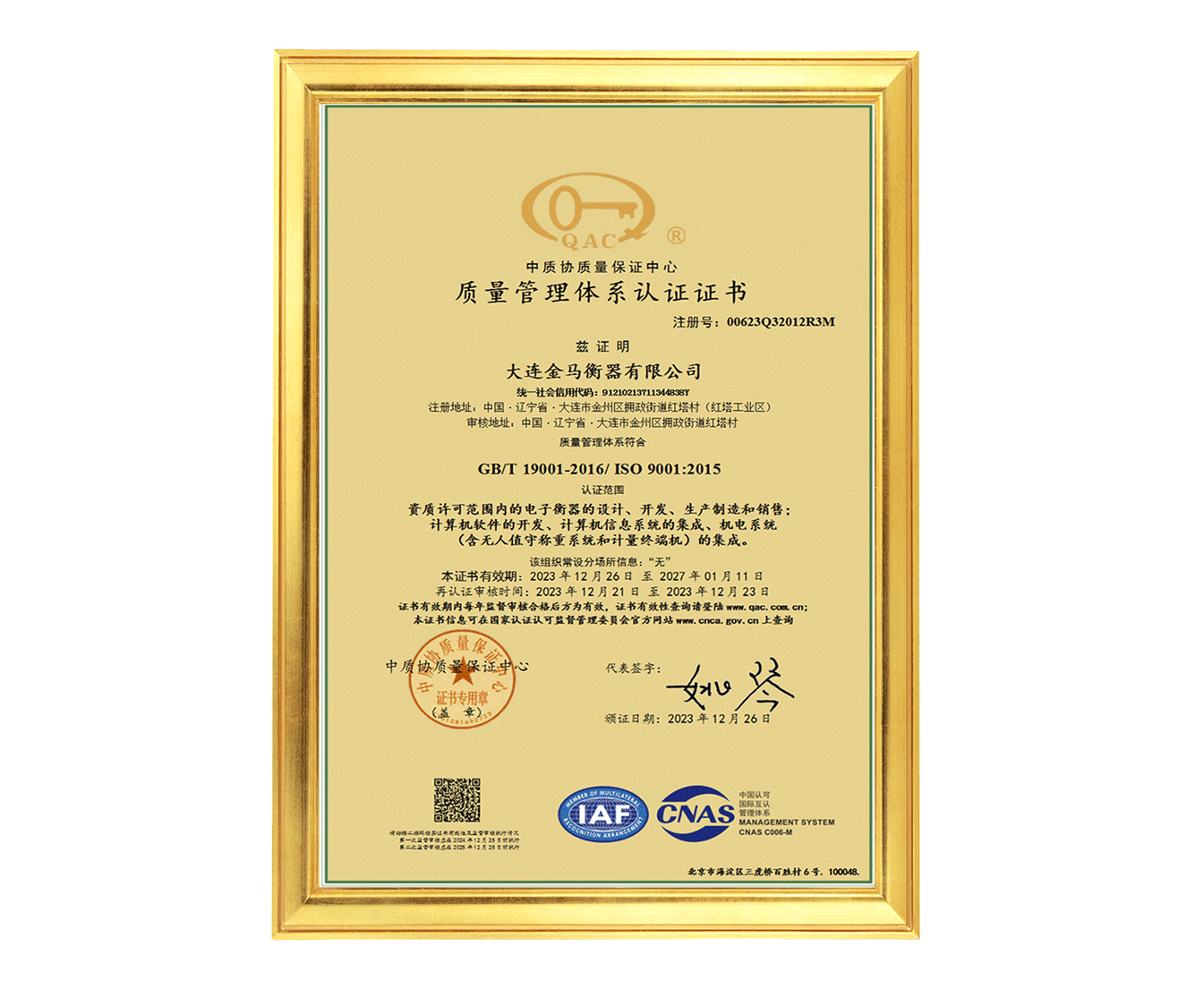 質(zhì)量管理體系認(rèn)證證書(shū)