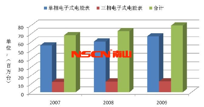 2007-2009年我國電 子式電能表產(chǎn)量分別為6,809.36萬臺(tái)、7,297.73萬臺(tái)、7,974.99萬臺(tái),2008年同比增長(zhǎng)7.17%,2009年同比增長(zhǎng) 9.28%,其中,單相電子式電能表2008年同比增長(zhǎng)8.09%,2009年同比增長(zhǎng)10.76%,電子式電能表市場(chǎng)需求總體呈現(xiàn)持續(xù)增長(zhǎng)的良好態(tài)勢(shì)。