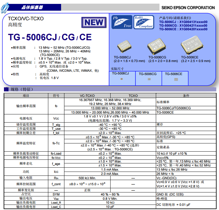 精密的時(shí)間是現(xiàn)代通信、導(dǎo)航定位以及計(jì)算機(jī)自動(dòng)控制的關(guān)鍵和核心,目前主流應(yīng)用都是采用TCXO溫補(bǔ)晶振來提供。高精度晶振廠商愛普生晶振新推出超小型溫補(bǔ)晶振TG-5006系列TG-5006CJ,TG-5006CG,TG-5006CE。其中每個(gè)型號(hào)都對(duì)應(yīng)3種版本:VC-TCXO、TCXO和TCXO(具待機(jī)功能),可滿足多樣化的用戶需求。低功耗、頻率穩(wěn)定、小型化的優(yōu)點(diǎn)讓其適合應(yīng)用于GPS設(shè)計(jì)、射頻和無線通信設(shè)備(CDMA、WCDMA、LTE、WiMAX)等有高精度和高可靠性要求的設(shè)備。那么TG-5006CJ,TG-5006CG,TG-5006CE三種型號(hào)該如何識(shí)別,三個(gè)型號(hào)規(guī)格參數(shù)又有什么區(qū)別呢?南山電子幫你具體來分析下,首先我們來看規(guī)格書:
