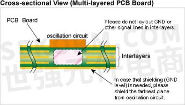 如果是多層板,在其它層面也不要有信號(hào)線穿過(guò)晶體的下方。