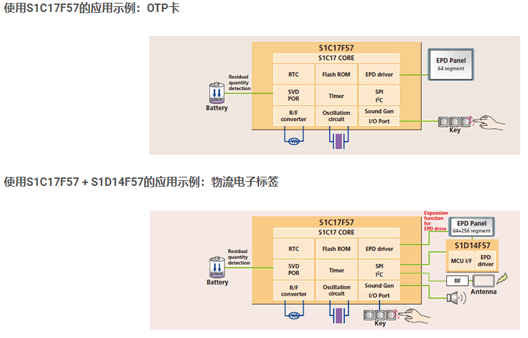 使用S1C17F57的應(yīng)用示例:OTP卡,使用S1C17F57 + S1D14F57的應(yīng)用示例:物流電子標(biāo)簽。