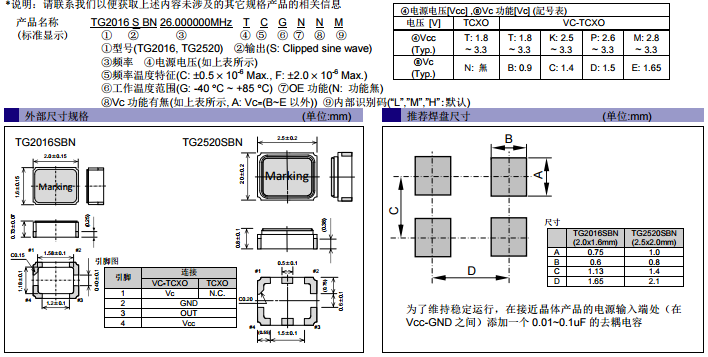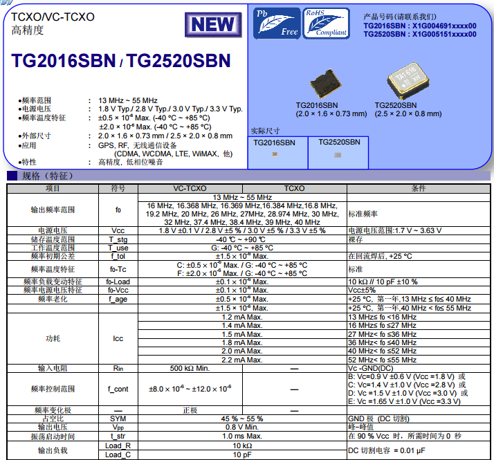 TG2016SBN,38.4MHz滿足市場對于小型化的需求.并且提供電源電壓1.8V-3.3V,低消耗電流。X1G004691013600,38.4MHz此款2016溫補晶振儲存溫度在-40°C to +90°C,工作溫度范圍在-40°C to +85°C。振蕩啟動時間只需1.0 ms Max.即可實現(xiàn)。X1G004691013600這種低電壓、高精度TG2016SBN溫補晶體振蕩器是小型化高端智能產(chǎn)品的福音,在市場上廣受歡迎。淡然除了TG2016SBN X1G004691013600 還有很多其他頻點很受歡迎:16MHz , 16.384MHz,19.2MHz,20MHz , 26MHz , 27MHz , 28.974MHz , 30MHz , 32MHz , 37.4MHz , 39MHz , 40MHz,頻率變化為正極。下面南山電子就給大家提供TG2016SBN的規(guī)格書以供大家選型參考