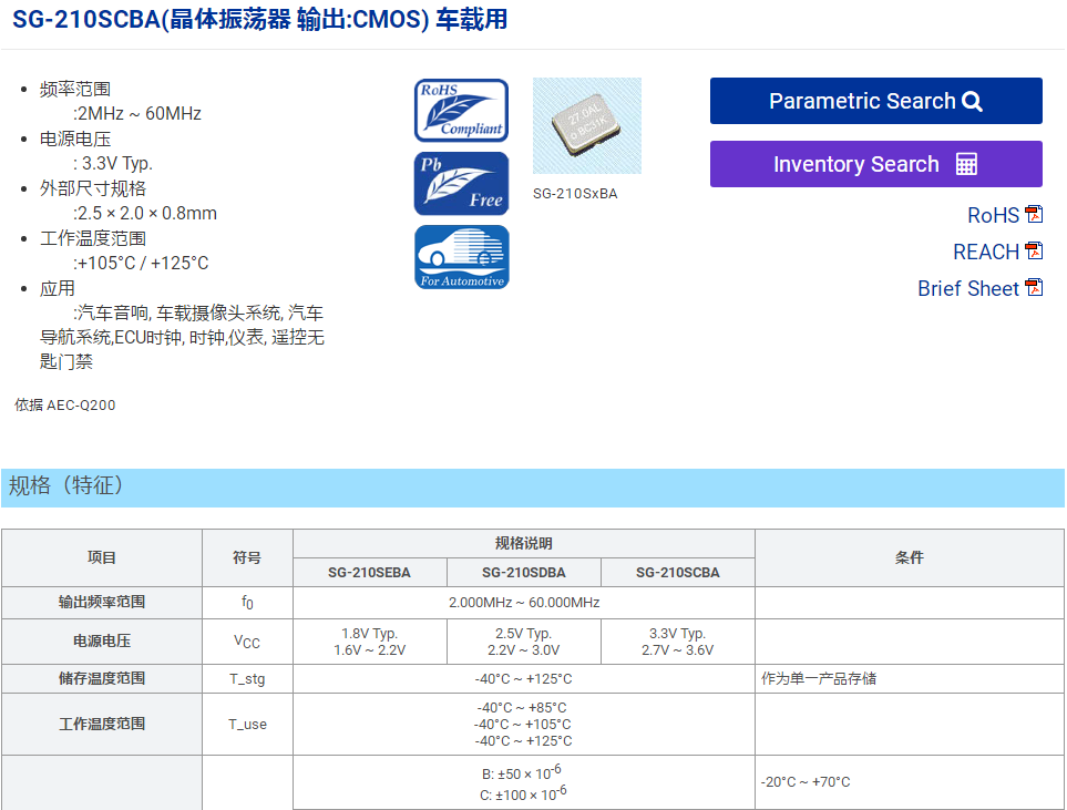 今天給大家介紹汽車級晶振SG-210SCBA,8MHz,X1G004591A004。SG-210SCBA是愛普生高性能晶振SG-210SCB系列中對應的車規(guī)級晶振,車規(guī)晶振SG-210SCBA采用4引腳封裝,其外部尺寸規(guī)格為2.5 × 2.0 × 0.8 mm,也就是我們常說的2520有源晶振,緊湊的結(jié)構(gòu)和小體積使產(chǎn)品適用于微空間的電路設計。SG-210SCBA的工作溫度和存儲溫度符合工業(yè)級溫度要求,產(chǎn)品可應用于嚴苛的溫度環(huán)境;功耗很低,產(chǎn)品適用于低功耗設計;其上升/下降時間,振蕩啟動時間極低,表明產(chǎn)品的響應速度很快;SG-210SCBA還具有高穩(wěn)定性,頻率老化率極低。可在-40℃下工作,溫度適應能力很強。SG-210SCBA頻率范圍為2MHz~60MHz,輸出方式為CMOS,電源電壓(典型值)有1.8V/2.5V/3.3V可選。產(chǎn)品具有待機功能,可大大減少能量消耗。產(chǎn)品符合AEC-Q200標準,SG-210SCBA廣泛應用于汽車導航系統(tǒng),車載攝像頭系統(tǒng),汽車音響,ECU 時鐘,時鐘,儀表,遙控無匙門禁。