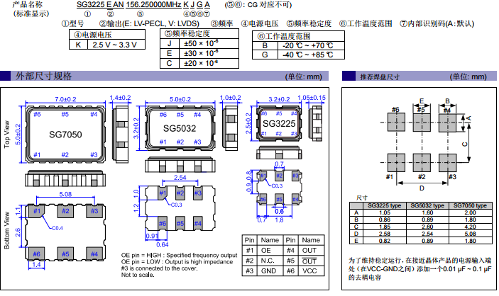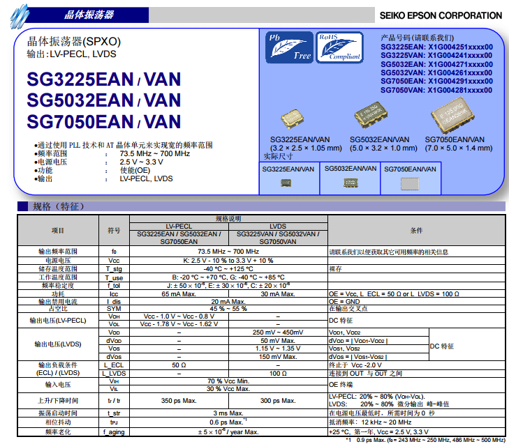 今天給大家介紹愛普生差分晶振中的SG3225VAN。我們都知道差分晶振中熱門的型號是SG7050VAN,但是隨著工業(yè)化的發(fā)展,小型化是未來的趨勢,SG3225VAN就是愛普生為時鐘設(shè)計新推出的SPXO晶振系列,適合10GbE、40GbE、100GbE超寬頻以太網(wǎng)絡(luò),可廣泛用于醫(yī)療、測試測量、消費電子、工業(yè)自動化等領(lǐng)域。SG3225VAN具有低功耗水平,并且通過OE引腳可實現(xiàn)輸出使能。在正常工作狀態(tài)下,電流損耗低至30mA,而*大啟動時間僅為3ms,保證了低功耗設(shè)計對設(shè)備喚醒速度的要求。當(dāng)輸出端口OE接地時,關(guān)閉電流*大20mA,使其更容易實現(xiàn)低功耗設(shè)計。SG3225VAN的工作溫度為-40℃~85℃,符合工業(yè)級產(chǎn)品標(biāo)準(zhǔn)。外觀尺寸為3.2×2.5×1.05mm,小型化封裝有利于提高系統(tǒng)設(shè)計的靈活性。SG3225VAN的電源電壓為2.5V~3.3V,輸出頻率73.5MHz~700MHz,結(jié)合低抖動PLL技術(shù)和內(nèi)置AT晶體單元,可產(chǎn)生穩(wěn)定的輸出信號;頻率偏移誤差*低±20ppm,*大相位抖動不超過0.6ps,SG3225VAN非常適合對時鐘信號完整性有嚴(yán)格要求的系統(tǒng)??紤]元件老化的影響,其頻率老化率僅為±5ppm/年,大大提高了元件的使用壽命。SG3225VAN分別支持LV-PECL和LVDS標(biāo)準(zhǔn)差分信號,增強了輸出信號的抗干擾能力,可作為標(biāo)準(zhǔn)模塊在電路中直接應(yīng)用。近年來,對小型化、多功能網(wǎng)絡(luò)設(shè)備的需求不斷增加,SG3225VAN以其低功耗、小型化、高穩(wěn)定性等優(yōu)點,在手持設(shè)備、穿戴式設(shè)備以及物聯(lián)網(wǎng)等網(wǎng)絡(luò)設(shè)備中具有廣闊的市場前景,可有效延長設(shè)備使用壽命、縮短產(chǎn)品開發(fā)周期。目前市場主流差分晶振都是6腳貼片封裝,頻率比普通晶振相比較高,可以從50MHz到700MHz.常用的頻率有:SG3225VAN,74.25MHz,100MHz,125MHz,148.5MHz,150MHz,200MHz等,下面南山電子就給大家提供SG3225VAN的規(guī)格書,供大家選型參考: