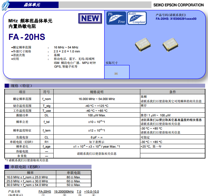 說到熱敏晶振很多人一定比較陌生,顧名思義,熱敏晶振就是內(nèi)置熱敏電阻的晶振,也可以稱為熱敏電阻晶振。今天就給大家介紹愛普生熱敏晶振的常用型號FA-20HS的特征和選型。首先我們來說說熱敏晶振的特征,有溫度傳感器的熱敏晶振在工作過程中受到了溫度感應時可以使晶體產(chǎn)品在工作過程中保持一個精準的不變的溫度,使晶振產(chǎn)品的精度給CPU提供信號的同時又能避免因為溫度的問題給晶振造成頻率較大的偏差。其實說白了,熱敏晶振就是為了可以代替昂貴的溫補晶振成本而制造的,雖然熱敏晶振并不能代替的溫補晶振,但是適合使用在一些常用電子產(chǎn)品如的智能手機,空調(diào)等。熱敏晶振采用的原理就是在普通貼片晶振的基礎上增加了一顆熱敏電阻,以及一顆變?nèi)?a href='http://www.ys074.cn/tiepianerjiguan.html' target='_blank'>二極管,利用了變?nèi)荻O管的容變功能在結(jié)合熱敏的傳感功能相結(jié)合,就變成了今天這個帶有溫度傳感功能的熱敏石英晶振,如愛普生推出的小尺寸內(nèi)置熱敏電阻的晶振FA-20HS。熱門頻點為FA-20HS  26MHz 7.8pF 10ppm 料號為X1E0002910026。下面南山電子就給大家分享下熱敏晶振FA-20HS規(guī)格書以供大家選型參考: