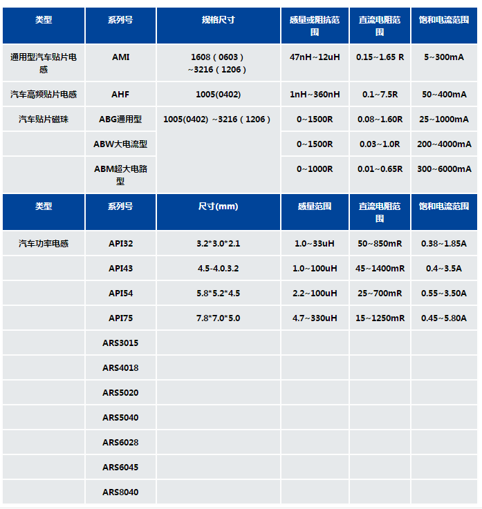 風(fēng)華汽車級(jí)電感常用規(guī)格燕通常有以下幾種:通用型車規(guī)電感AMI系列,車規(guī)功率電感API系列,汽車級(jí)高頻電感AHF系列,車規(guī)磁珠ABG,ABW,ABM系列,具體規(guī)格參數(shù)如下圖所示: