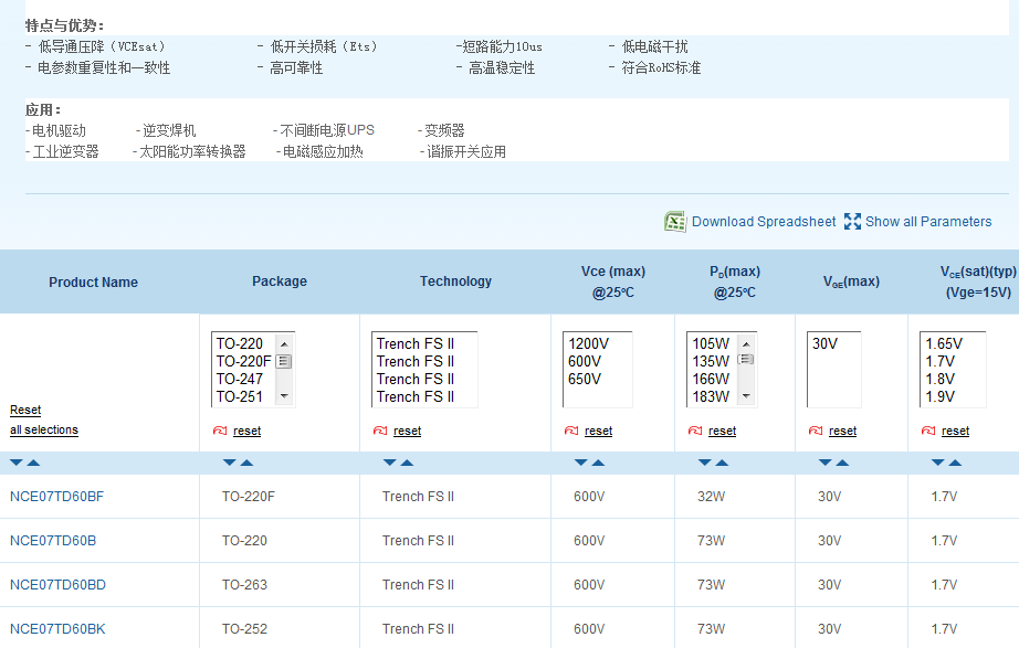 如上圖所示:針對(duì)不同的應(yīng)用需求,推出了新潔能IGBT產(chǎn)品系列,確保在特定應(yīng)用中,器件保持高效工作狀態(tài),助您實(shí)現(xiàn)理想的整機(jī)效率。新潔能IGBT模塊特別對(duì)于焊接、太陽能、UPS、電機(jī)驅(qū)動(dòng)和家用電器等硬開關(guān)應(yīng)用,推出了低速(<20KHZ)和高速系列(<60KHZ)產(chǎn)品系列,提供各種封裝形式,方便用戶靈活設(shè)計(jì)。對(duì)于感應(yīng)加熱、太陽能等諧振開關(guān)應(yīng)用,推出了新一代1200V、1350V產(chǎn)品系列,具有高擊穿電壓、大通流容量等優(yōu)勢;與反并聯(lián)二極管或單片集成二極管合并封裝,方便應(yīng)用設(shè)計(jì)。全新一代新潔能IGBT產(chǎn)品可以廣泛應(yīng)用于電機(jī)驅(qū)動(dòng),PFC,逆變器,UPS,逆變焊機(jī),變頻器,感應(yīng)加熱等應(yīng)用場合,南山電子授權(quán)經(jīng)銷新潔能IGBT,在本公司某寶店鋪——南山E店均有現(xiàn)貨,歡迎廣大新老顧客來電垂詢,選型交流。