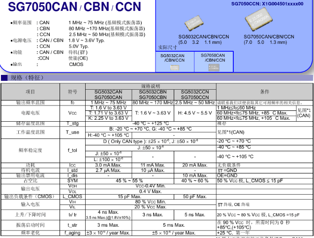 大家好,近期很多客戶詢問一款50MHz晶振SG7050CAN,50MHz,TJGA,X1G004481001200。50MHz晶振是應(yīng)用比較廣泛的一種頻率,其實常用的50MHz晶振大部分是50MHz有源晶振,可以用于銀行金融系統(tǒng),稅控系統(tǒng),遠程抄表系統(tǒng),加密狗,測試儀器,超聲頻,網(wǎng)絡(luò)傳輸ADSL,安防(攝像頭,報警器)等,當然熱門的還有比如溫補類型50MHz晶振TG5006CG 50MHz,南山電子給大家分享下50MHz晶振:SG7050CAN,50MHz,TJGA,X1G004481001200的規(guī)格書以供大家選型參考: