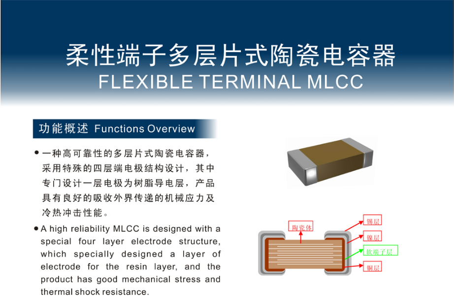 柔性端子貼片電容的產(chǎn)品特點(diǎn):高可靠性,高抗彎曲性能,高耐振動(dòng)性能,高耐受冷熱沖擊性能。