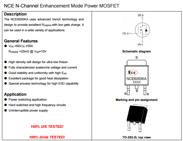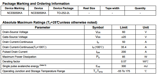 大家好 ,今天給大家介紹一款適用于60V電動車控制器的可替代國外型號的MOS管NCE6050KA。場效應(yīng)管NCE6050KA是一款60V漏源電壓,50A電流,TO-252封裝的N溝道MOS管,說到60V和50A,我想甚至連不太接觸電子元器件的人也有點熟悉,好像在哪里見過,相信大家都買過電動車,一般買的時候肯定聽過電動車是60V或者48V的。NCE6050KA就是一款適用于60V電動車控制器的場效應(yīng)管。目前在60V電動車控制器的應(yīng)用中,MOS管主要損耗包括開關(guān)損耗(開通過程和關(guān)斷過程),導(dǎo)通損耗,截止損耗(漏電流引起的,這個忽略不計),還有雪崩能量損耗。只要把這些損耗控制在MOS管承受規(guī)格之內(nèi),MOS管即會正常工作。所以選取一款合適的MOS管是很有必要的,常用的60V電動車控制器有捷捷微的JMTK50N06B,新潔能的NCE6050KA,都是不錯的選擇,近期市場上NCE6050KA貌似很受青睞,我們南山電子就備有庫存,下面就給大家分享下60V電動車控制器的常用型號NCE6050KA的規(guī)格書: