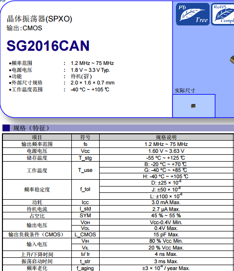 EPSON推出的2016有源晶振:SG2016CAN,是一款CMOS輸出的晶體振蕩器。頻率穩(wěn)定度可達(dá)±50PPM,頻率老化度僅為±3PPM/year,具有較高的穩(wěn)定性,滿足光模塊長期使用的要求。SG2016CAN封裝小,尺寸為2.0mm×1.6mm×0.7mm,光模塊體積小,采用2016有源晶振,更容易PCB設(shè)計(jì)。SG2016CAN的工作溫度范圍:-40℃~105℃,具有較高的工作溫度。5G前傳光模塊中,一般需要選擇寬溫的工作期間,所以所需的2016晶振也需要更高的溫度范圍,使用SG2016CAN可以滿足光模塊高溫的需求。下面南山電子就給大家看下這款2016有源晶振的規(guī)格書,以供大家選型參考: