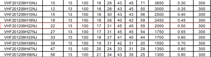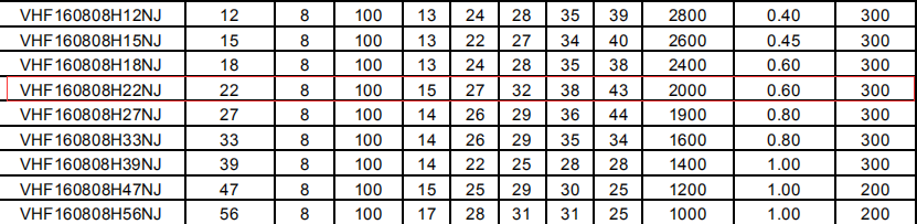 對比后發(fā)現(xiàn),在測試頻率100MHz的情況下,兩者飽和電流均為300mA,VHF160808H22NJT的自諧振頻率Min2000MHz,直流電阻Max0.6Ω,VHF201209H22NJT的自諧振頻率Min1700MHz,直流電阻Max0.5Ω,所以說如果自諧振頻率在2000以上兩者都可以,在1700—2000MHz時(shí),只能用VHF201209H22NJT。