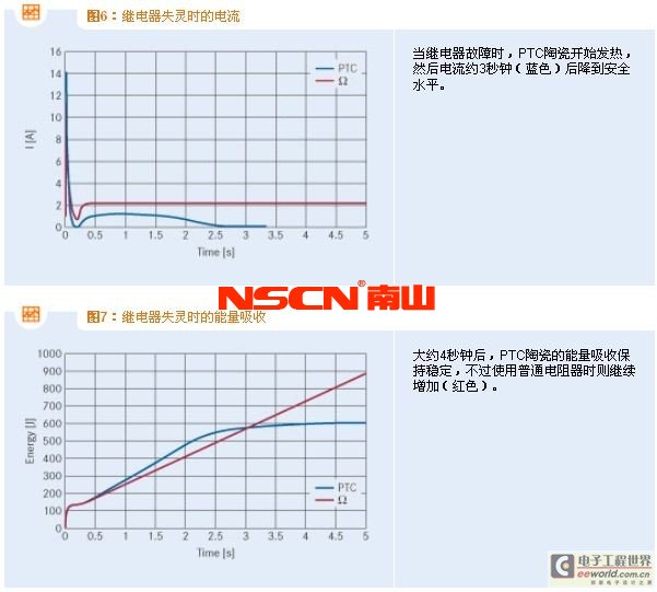 當(dāng) 發(fā)生故障時,PTC熱敏電阻用作限流元件的優(yōu)勢就會十分明顯。如果繼電器接通失敗,負(fù)荷電流將流經(jīng)充電電阻器,并產(chǎn)生強(qiáng)大的熱應(yīng)力,這要求電阻器有相應(yīng)的 尺寸。若采用基于PTC陶瓷的充電電阻器,其電阻會由于強(qiáng)大的起始功率損耗而升至數(shù)10 k,從而能夠在故障發(fā)生期間限定電流(參見圖6)。在約三秒之后,先流經(jīng)兩電阻器然后流經(jīng)總體電路的電流已跌至數(shù)10 mA。有關(guān)吸取能量的比較,請參見圖7。
