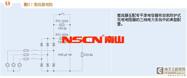 強(qiáng)大的沖擊電流在約150 ms之后使兩個自我防護(hù)式充電電阻器產(chǎn)生高電阻性,進(jìn)而限制電流。而流經(jīng)固定電阻器的電流則僅由極低的電源線電阻進(jìn)行限定,因此固定電阻器中會產(chǎn)生非常高功率的能量轉(zhuǎn)換。