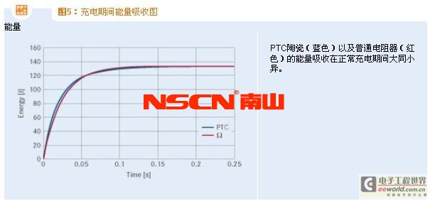 在短時間內(nèi),并聯(lián)的兩個自我防護(hù)式充電電阻器與外界達(dá)到熱平衡,同時由于PTC陶瓷的高電阻值,吸收的能量僅有略微上升。最終產(chǎn)生的能量吸收與圖7所示類似。