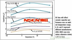 圖2所示為在某典型便攜式應(yīng)用產(chǎn)品的使用環(huán)境溫度范圍內(nèi),直流偏置對(duì)幾種不同電容的影響。查看圖中的直流偏置特性,可看到,風(fēng)華高科生產(chǎn)的 10μF,6.3V 0603疊層陶瓷片式電容在1.8V 直流偏置及-30°C下的電容量值為5.75μF。需注意電容器和電容量之間的區(qū)別。電容量是從應(yīng)用的角度看到的電容的實(shí)際值。廠商C生產(chǎn)的相同電容器在 同樣條件下的電容量值為3.5μF。事實(shí)上,風(fēng)華高科的4.7μF電容差不多與廠商C的10μF電容一樣好。
