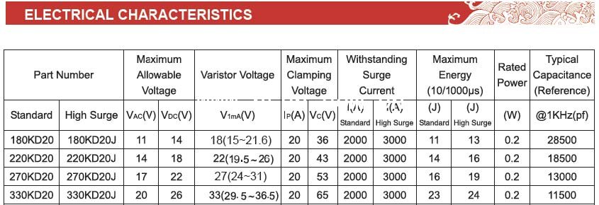 • 電壓規(guī)格從18V~1800V,突波耐電流能力從幾百安培到幾十千安培不等,單體最大可達(dá)70KA