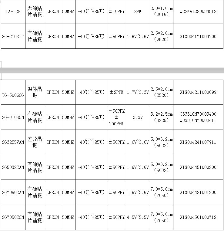 晶振50MHz也是應(yīng)用比較廣泛的一種頻率,其可以用于銀行金融系統(tǒng),稅控系統(tǒng),遠(yuǎn)程抄表系統(tǒng),加密狗,測(cè)試儀器,超聲頻,網(wǎng)絡(luò)傳輸ADSL,安防(攝像頭,報(bào)警器)等,其實(shí)常用的50MHz晶振大部分是50MHz有源晶振,比如50MHz溫補(bǔ)晶振——愛(ài)普生晶振TG5006CG 50.000000 MHz,南山半導(dǎo)體是愛(ài)普生晶振官方授權(quán)中國(guó)地區(qū)核心代理商,擁有國(guó)內(nèi)唯一一家愛(ài)普生授牌中國(guó)地區(qū)有源晶振燒錄中心,實(shí)現(xiàn)了小批量,快速交付的客戶(hù)需求。還是老規(guī)矩,我們深信客戶(hù)的體驗(yàn)度是首要標(biāo)準(zhǔn),在這里繼續(xù)整理常用愛(ài)普生晶振50MHz的晶振型號(hào)給大家選型參考: