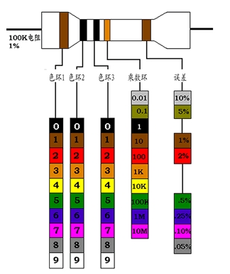 色環(huán)電阻,是在電阻封裝上(即電阻表面)涂上一定顏色的色環(huán),來代表這個電阻的阻值。色環(huán)標示主要應用圓柱型的電阻器上,如:碳膜電阻、金屬膜電阻、金屬氧化膜電阻、保險絲電阻、繞線電阻。